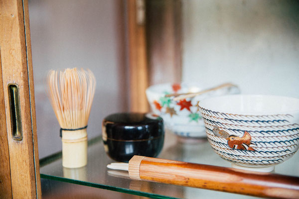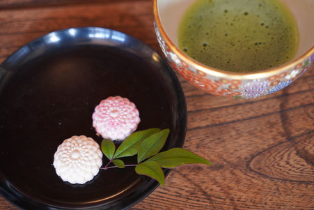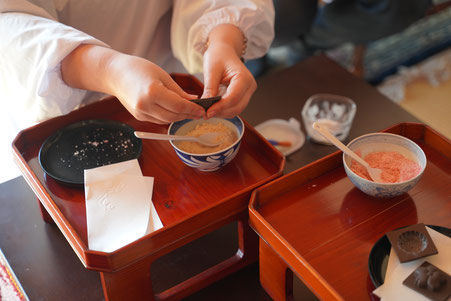 女将が集めた茶器を使ったお抹茶作りと、女将特性和三盆(高級お砂糖)を使ったお干菓子作り。